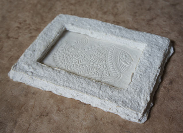 額縁専用の漉枠を作って制作した紙製の額縁。ミルフィーユのように漉いたばかりの紙をどんどん重ねて厚みを出しています。額の中の絵は、エスニック印版でエンボスしたものです。