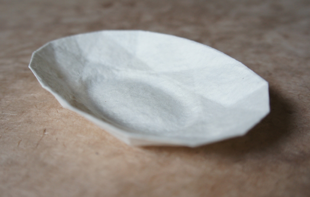 木片から削りだした木型を使った紙製のうつわ。カットガラスよう楕円形の豆皿をイメージして、漉いた紙を押しつけてエッジが出るように何度も何度も押しつけましたが…