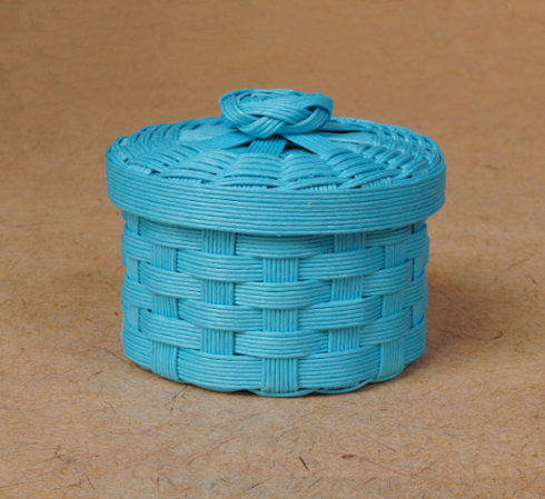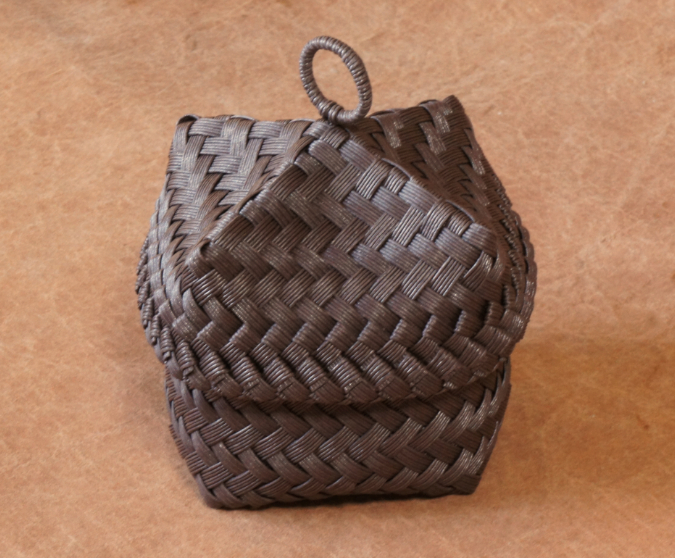 アジアンテイストの蓋つき小物入れ。枡網代編みで編みあげたシンプルな形に窪みをつけて仕上げました。この窪みが味わいを生み出しています。編み目の引き締め加減が難しい。