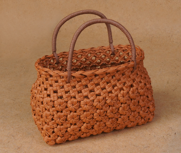 かごの底の波打った凹凸が特徴的な組みかご。四つ目組み(斜め組み)で、面パーツを六面に組むことで凹凸を作りだしています。組み目を均一に詰めることが難しく大変でした。
