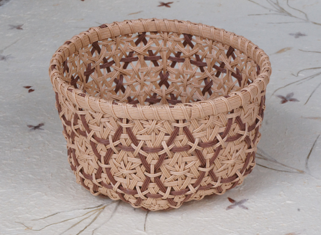 牡丹華編みの小さなかご。六角かご目の上に、3方向に茶色をのせてからすくっていきます。本数が多いので手順を間違えないように編んでいけば、綺麗な模様の出来上がり。