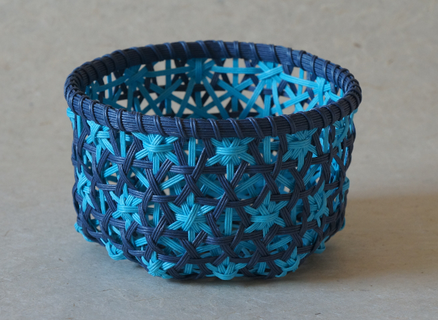 紙バンドを使った華編みかご。正六角形に整えながら編み上げる、複雑で美しい模様。ふっくらとした形と二色遣いの丸みのある編模様で、かわいいかごに仕上がりました。