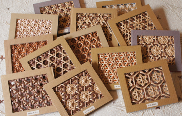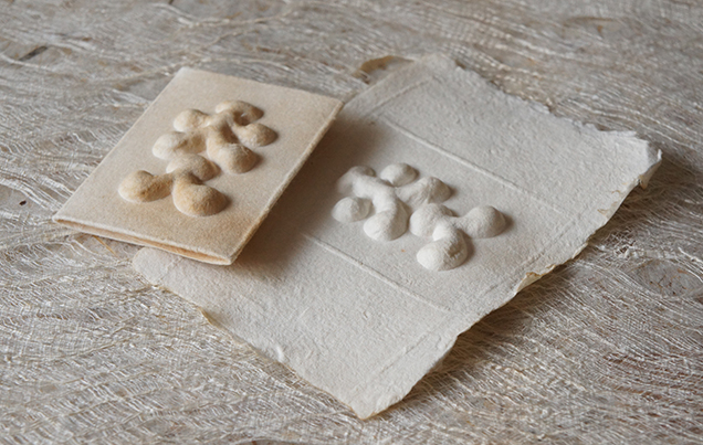 木片から削りだした木型を使った紙製のパッケージ。家紋入り巴瓦のような八角形の文様の木型とプレーンな木型に、漉いた紙を押しつけて立体的に作り、セットにしました。