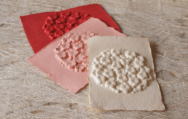 赤く染めた紙料で、木型を使わず立体的に漉いた紙皿とクッキー型で作った紙製アルファベット文字。ざるのような調理器具で漉いて、自然乾燥をさせたので素材感は残りました。