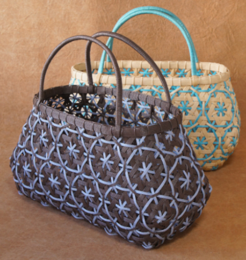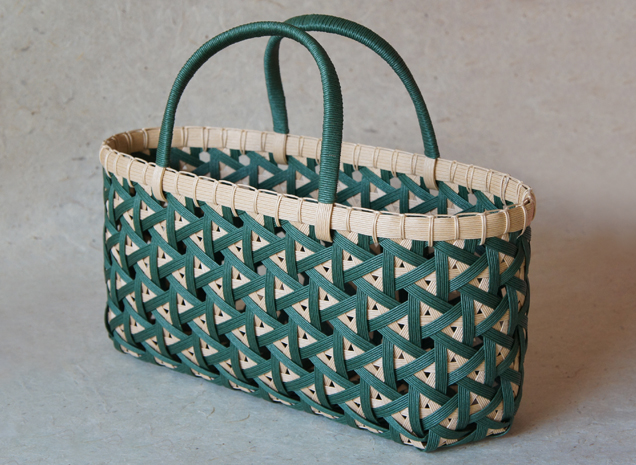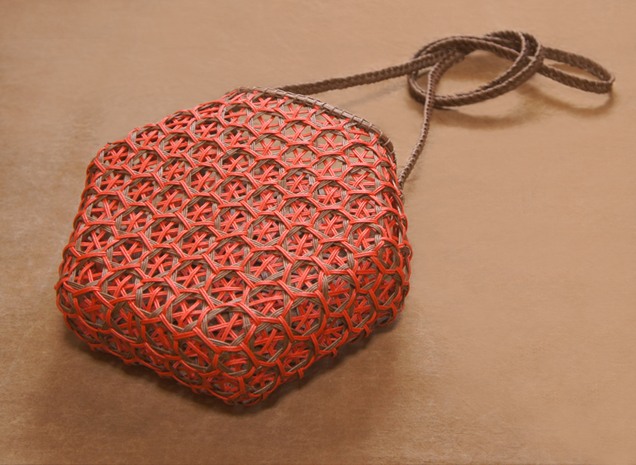 華編みの基盤となる六つ目編み。六角形の編み目が印象的で、斜めの構成でできた強度のある編み方です。角度を整えながら、底面から側面へと立ち上げる難しさがあります。