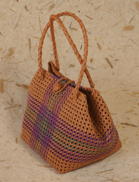 紙バンドを使ったかごバックづくり。初めて作ったものは、設計図通りに裁断してけれど実際にはうまく作れず、裁断の長さを修正して再度制作して出来上がったのがこの小品です。