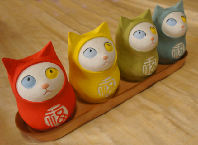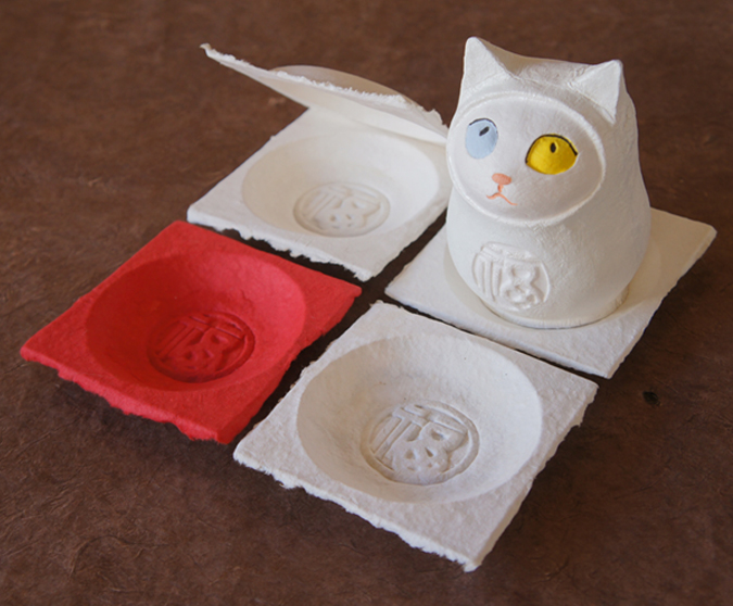 「キャスティングペーパー」と呼ばれる型を使って紙を成形する手法でつくりました。愛猫をモデルにした「にぁダルマ」は、完成度はまだまだだけど、出来上がったのでうれしい。