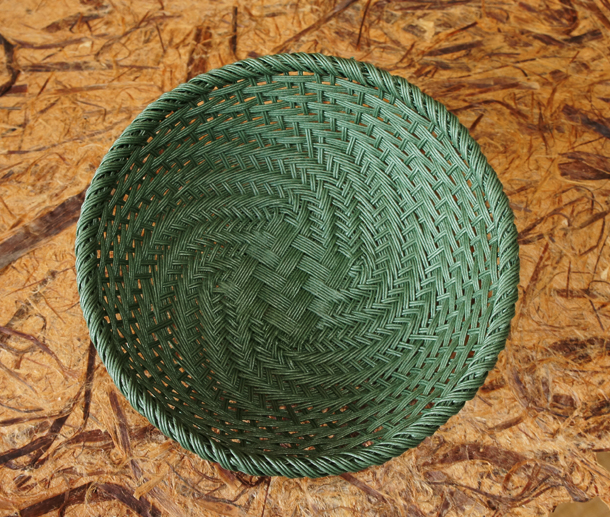 クラフトバンドで編む伝統の和ざる。渦を巻くように放射線状に広がった編み目模様が美しい少し高さのある平ざるです。竹細工のよう強度はないので、使い方は工夫して。
