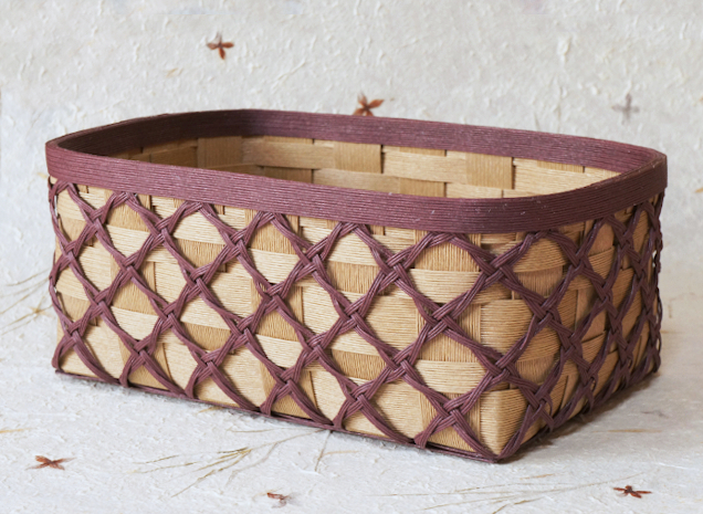2本の紙バンドを井形に交差させ編み上げる『違い四つ目編み』。クラフトカラーの片流れ網代編みに、ココアカラーの違い四つ目編みを重ね合わせた便利かごの出来上がり。