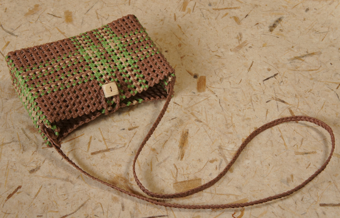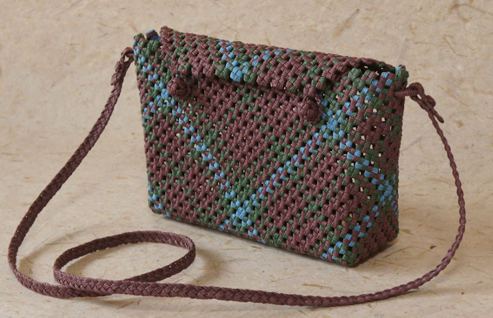 2本の紙バンドで結んで編む石畳編みのショルダーバッグ。本体は格子柄で上底仕様、ショルダーひもは平編、留めひもは丸編、留め具は手彫り木片といろいろ凝らしてみた。