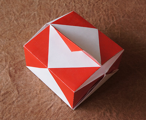 折り紙でつくった「あ」を入れるパッケージ。折り上がったときの形をイメージして、折り線に合わせて紅白グラフィックをデザインしましたが、完成度はまだまだというところですね。