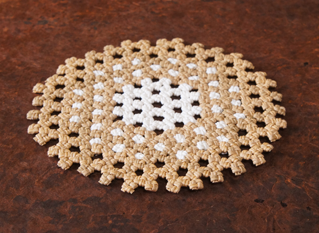 紙バンド2本どりで、2本結び編みを六角形につないで編レースのようにみえるレーシー編み。ドット柄模様がかわいい少し大きめのコースターができました。鍋敷きになるかも。