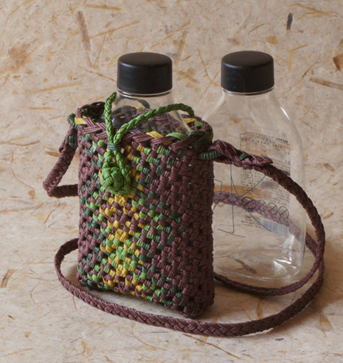 石畳編みのボトルホルダーを制作。ワインボトルとペットボトルの大きさの違いは、紙バンドの本数幅でサイズを調整。実用性はありませんがおもしろいものができました。