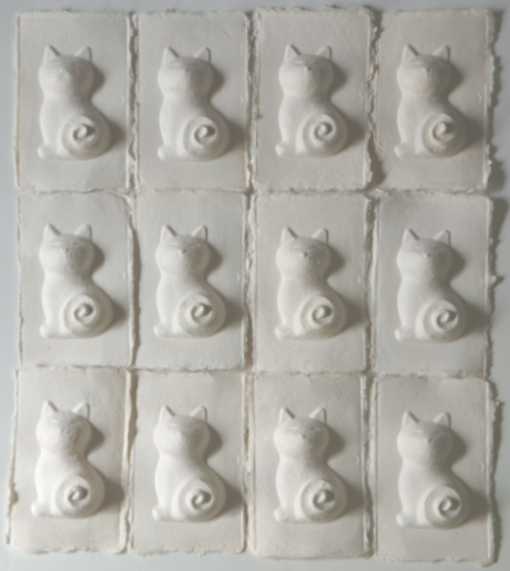 型にパルプをつめてつくるキャスティングペーパー。巻き尻尾ネコをモチーフに木型をつくり、漉いたリサイクルペーパーを張りつめて、レリーフタイル風に並べてみました。