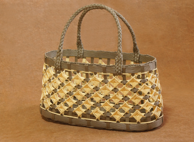 縄文時代後期にはつくられていたという網代編み。3・3の網代で枡目をつくり、サンドベージュとペールピンクで模様を浮きだたせ、古典的ながら軽やかに仕上がりました。