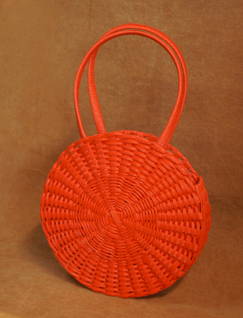 チェリーレッドの丸い手提げかごバッグ。無駄に用尺が長かったり、本数が足りなかったり、手持ち紐の取り付け方など手間取りましたが、愛らしいかごバッグになりました。
