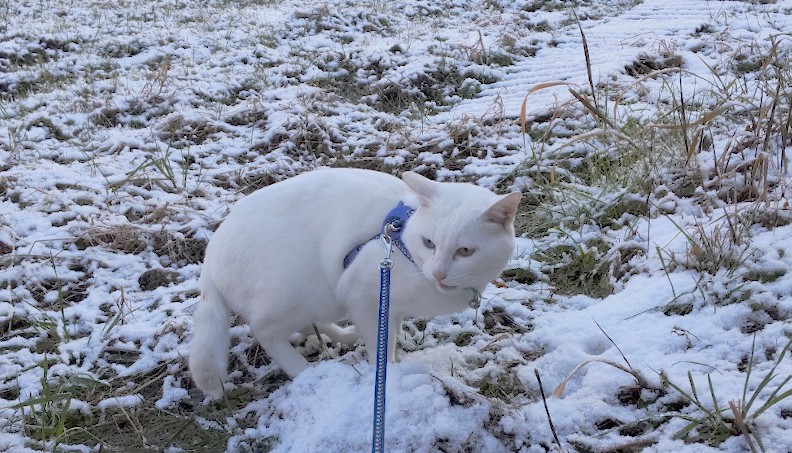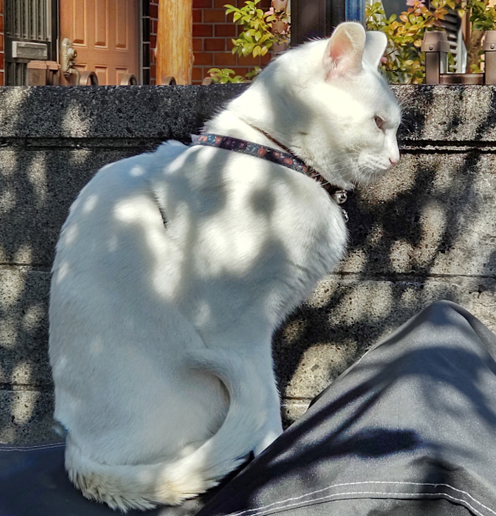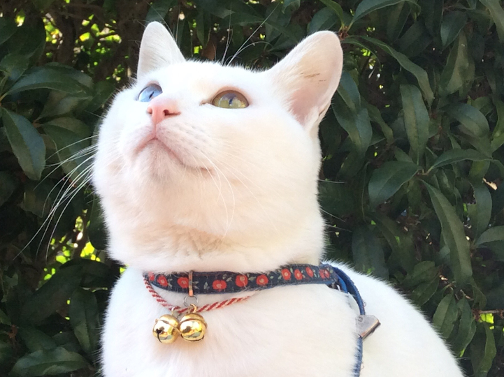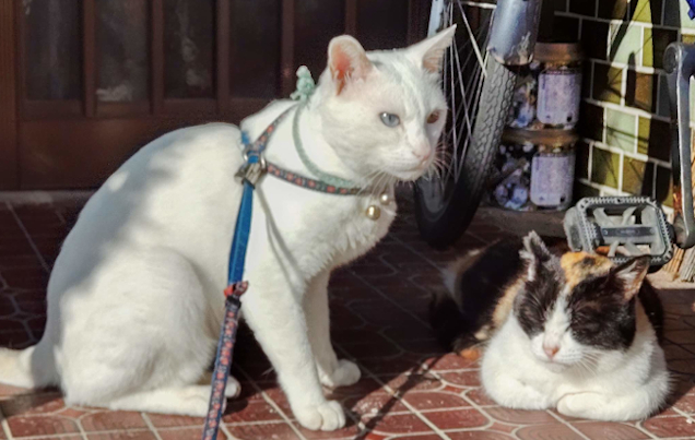迷い猫が我が家に住み着いて3年半になりました。左右の目の色が違うオッドアイの白猫で、障害もなく元気に育ってくれました。外に出たがるので朝夕に散歩をしています。