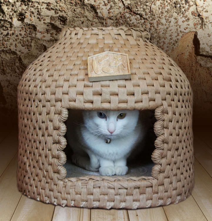 長野県・栄村の猫つぐら。藁の代わりに紙紐を撚り戻して平紐にしてつくる。長時間を費やした超大作でしたが、初物にして出は上出来で、愛猫も喜んでいます。