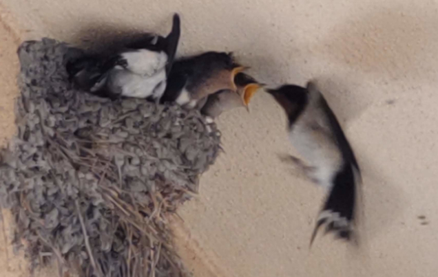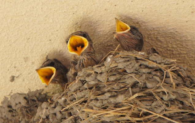 天敵の猫が見上げているというのに、我が家の軒下にツバメが巣作り。三羽のヒナが元気に口を広げて、親鳥のエサを待っています。幸運を招くというツバメにハートを見つけました。