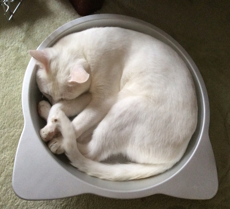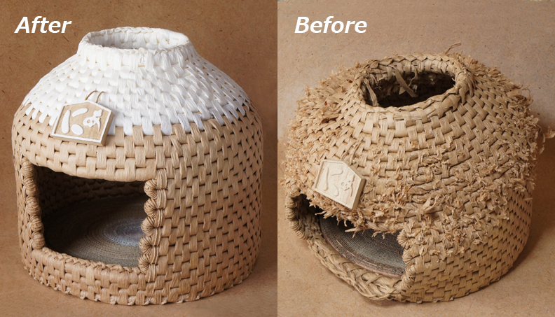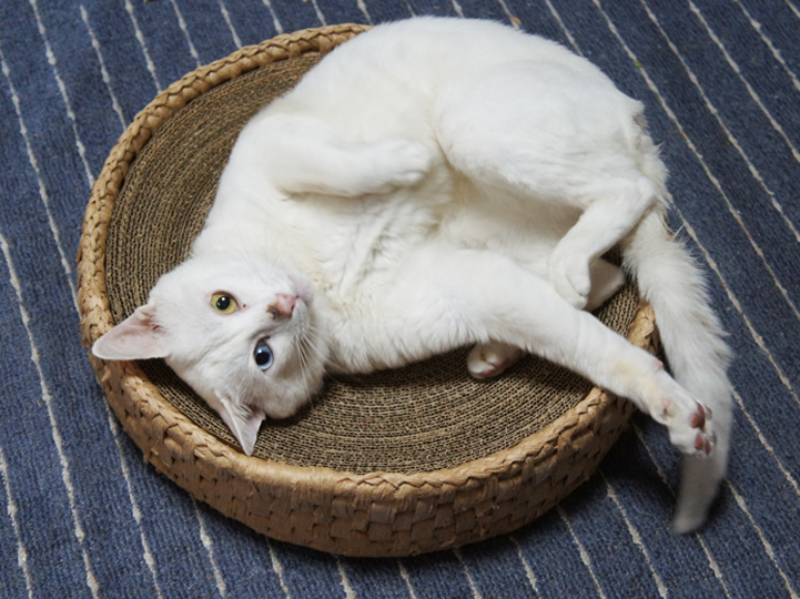 最初につくった猫つぐらから修繕を重ねた結果、つめとぎベッドに化けました。興味がわくようにマタタビを振りかけ、つめとぎ面に丸みをつけたので長く愛用してくれたらいいなぁ。