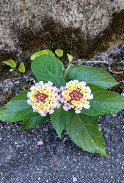 猫散歩の途中、道端に咲くカラフルな花を発見。ブラジルなどに生息する熱帯植物『ランタナ』で、かわいい花姿と裏腹に繁殖力の強い要注意外来種らしい。どこから飛んできたの。