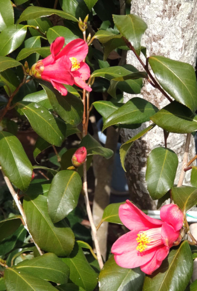 4月初旬、紅ツバキが咲きました。白い侘助ツバキの自家製種を鉢植えしたつもりでいたのに、思わぬことに紅色の一重ツバキが… 驚いています。どこからか飛んできたのでしょう。