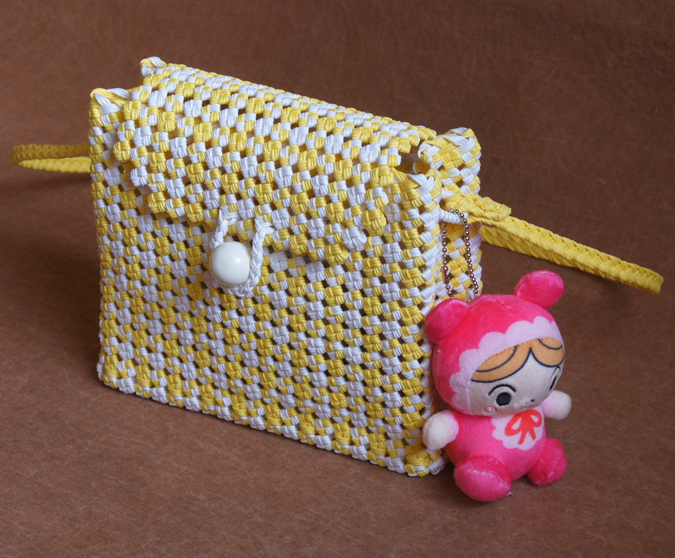孫娘の入園祝いにつくったショルダーバッグ。黄色が好きで赤ちゃんマンが好きだというので、白と黄色のギンガムチェックに手のひらサイズのマスコットをつけて出来上がり。