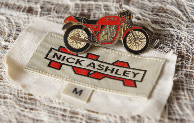 限定色レッドのGB250クラブマンピンバッジ。一緒に写っているのはニック・アシュレイのネームタグ。ローラ・アシュレイの息子でモータサイクルウェアのデザイナー。