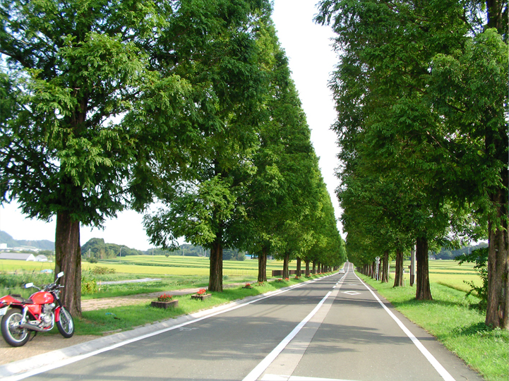 GB250で走ったマキノにあるメタセコイヤ並木道。滋賀県とは思えない広がりのある風景を目のあたりにすると、紅葉の季節にまた来ようという思いが強くなります。