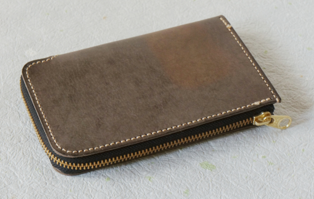 餞別でいただいた、手縫い革財布キット。裁断もされ針穴も開いている革、ファスナー、針と麻糸に制作工程図と、初心者にとってありがたいキット。初めてにしてはまあまあかな?